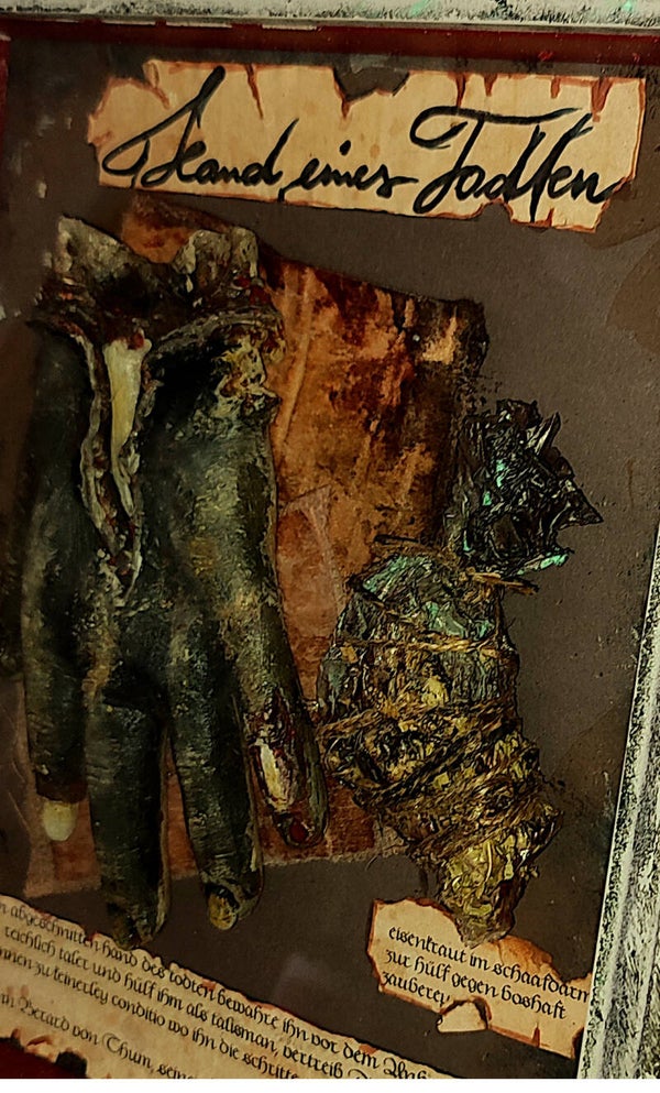 `Ein abgeschnitten hand des todten bewahre ihn vor dem Unheile, schaffe ihm reichlich taler und hülf ihm als talisman, vertreib Diepe und sei ihm wollgesonnen zu keinerley conditio wo ihn die schritte auch hinkehren mögen. ` Johann Berard von Thum, seiner Zeiten Kraemer zu Nuernberg A.D. 1742