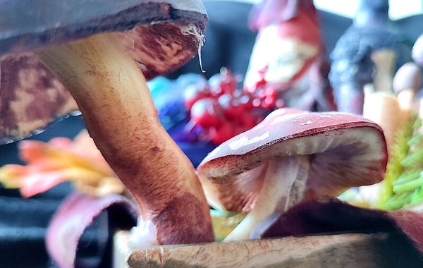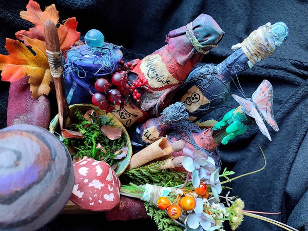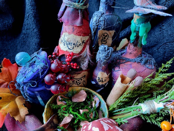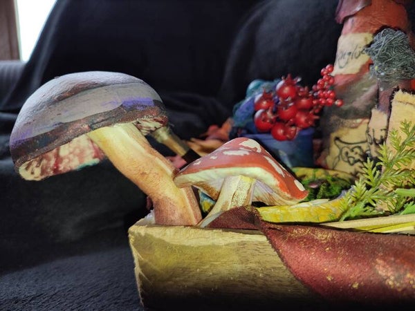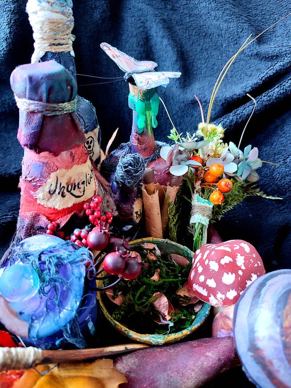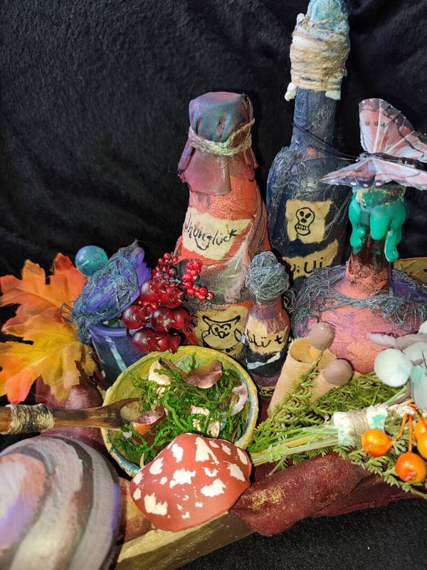 Holztablett liebevoll dekoriert mit Glasfläschchen und -schälchen, Pilzen, künstlichen sowie natürlichen Pflanzen und einer Zauberrolle, die ihr selbst mit eurem eigens erdachten Zauberspruch vollschreiben oder bemalen könnt