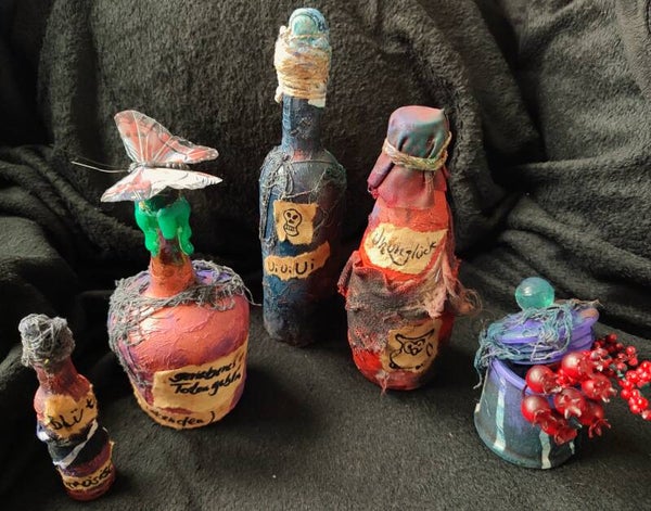 Materialien: Kunststoff, Holz, Glas, Stoff, Kleber, Acrylfarben, künstliche sowie natürliche Pflanzenteile